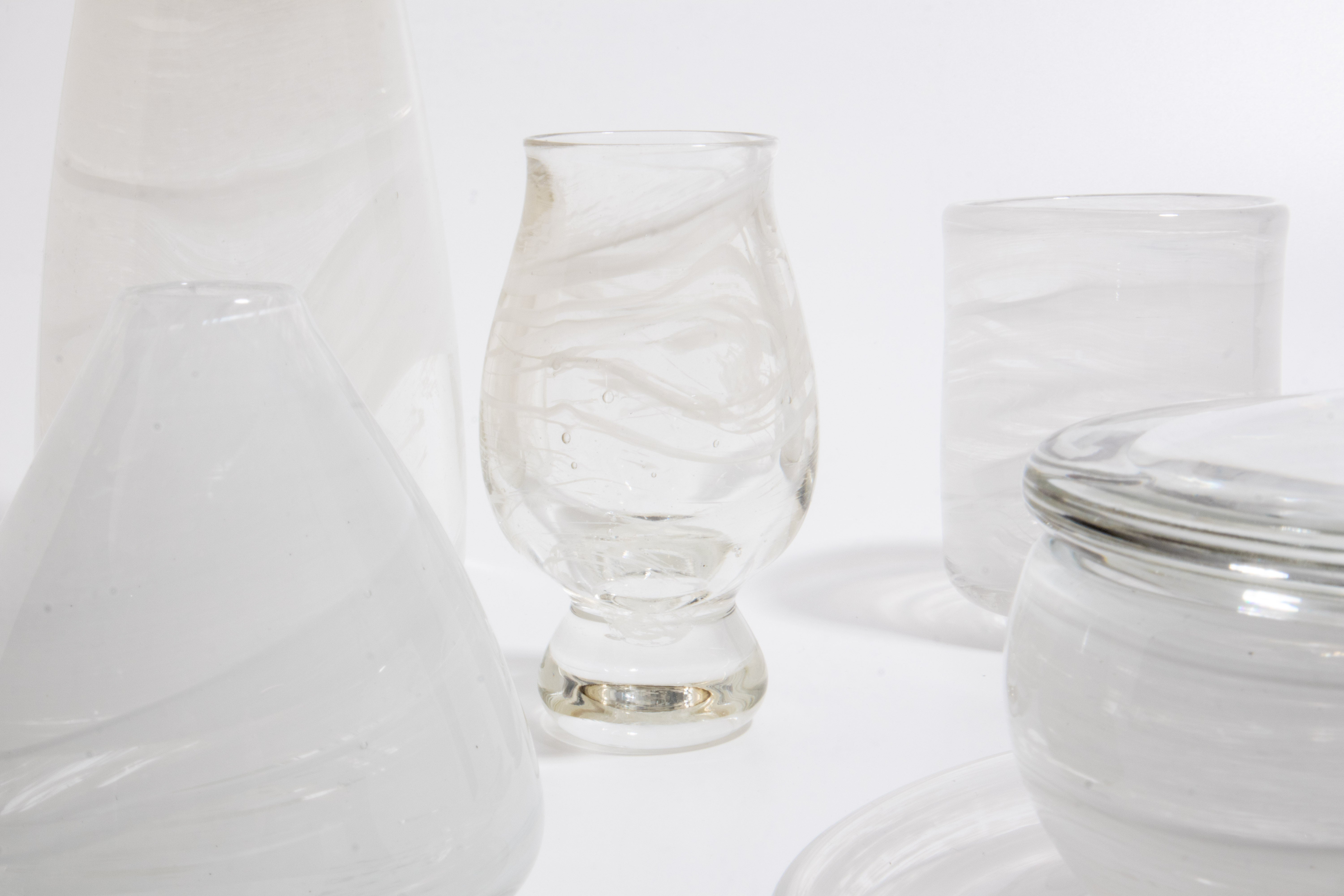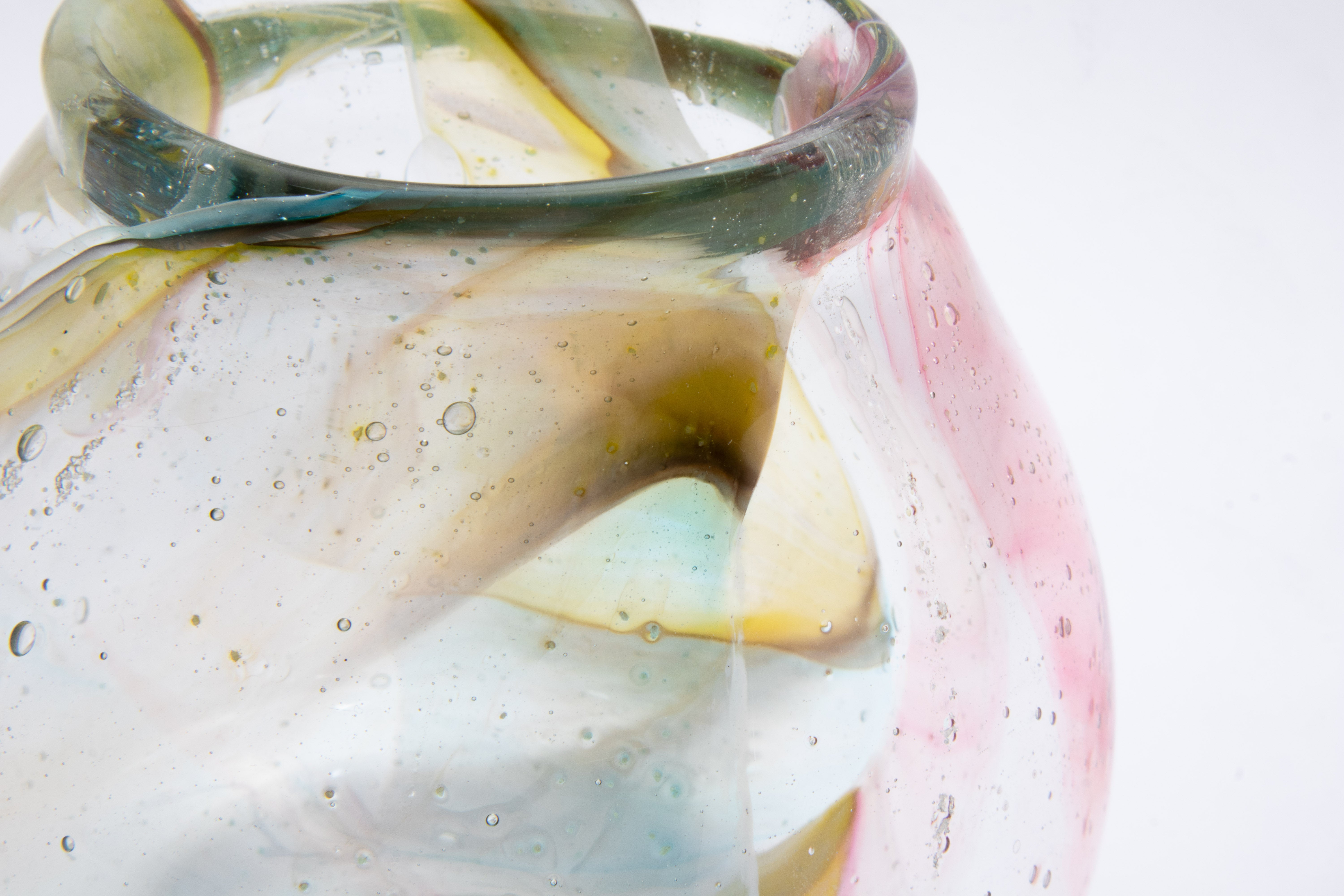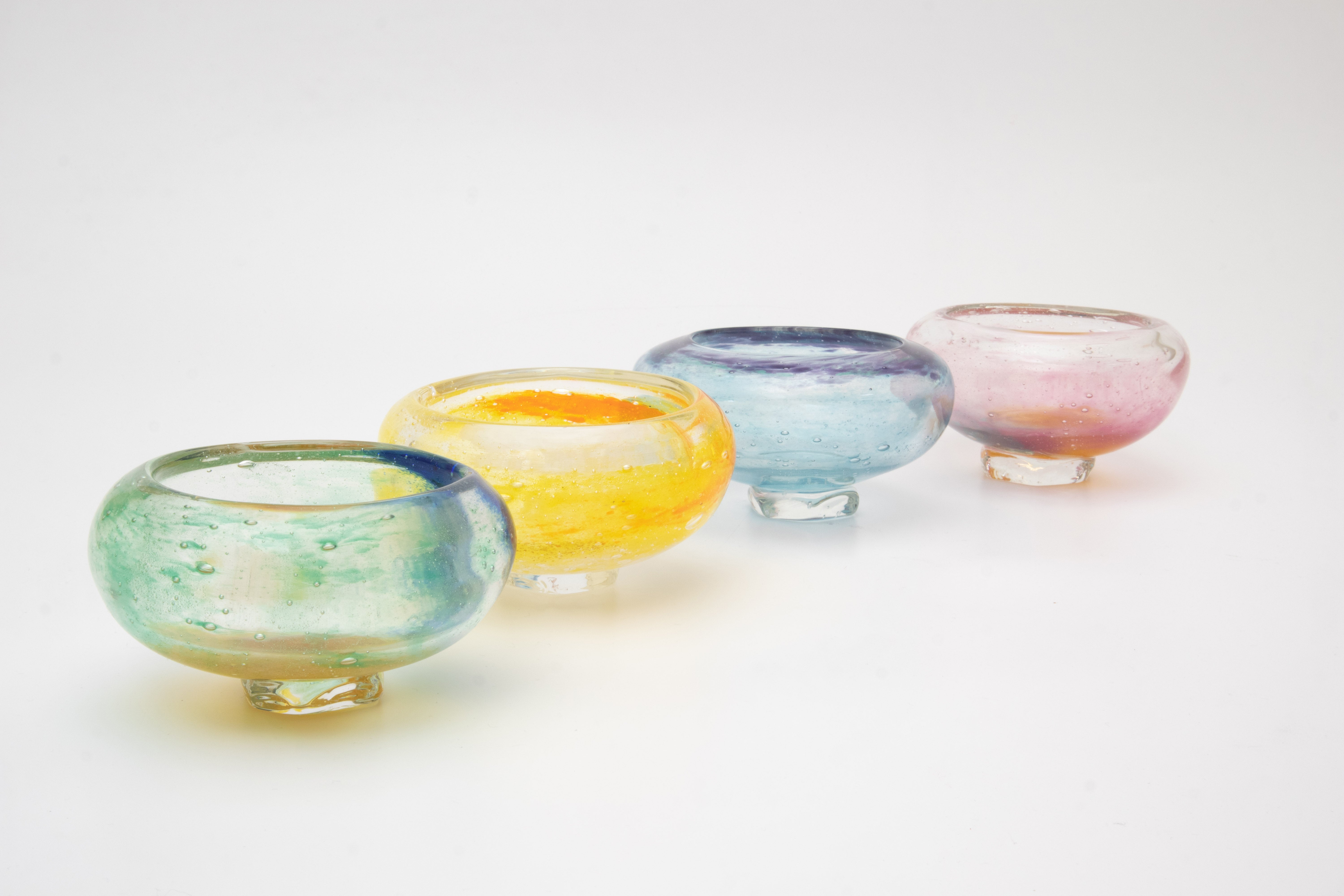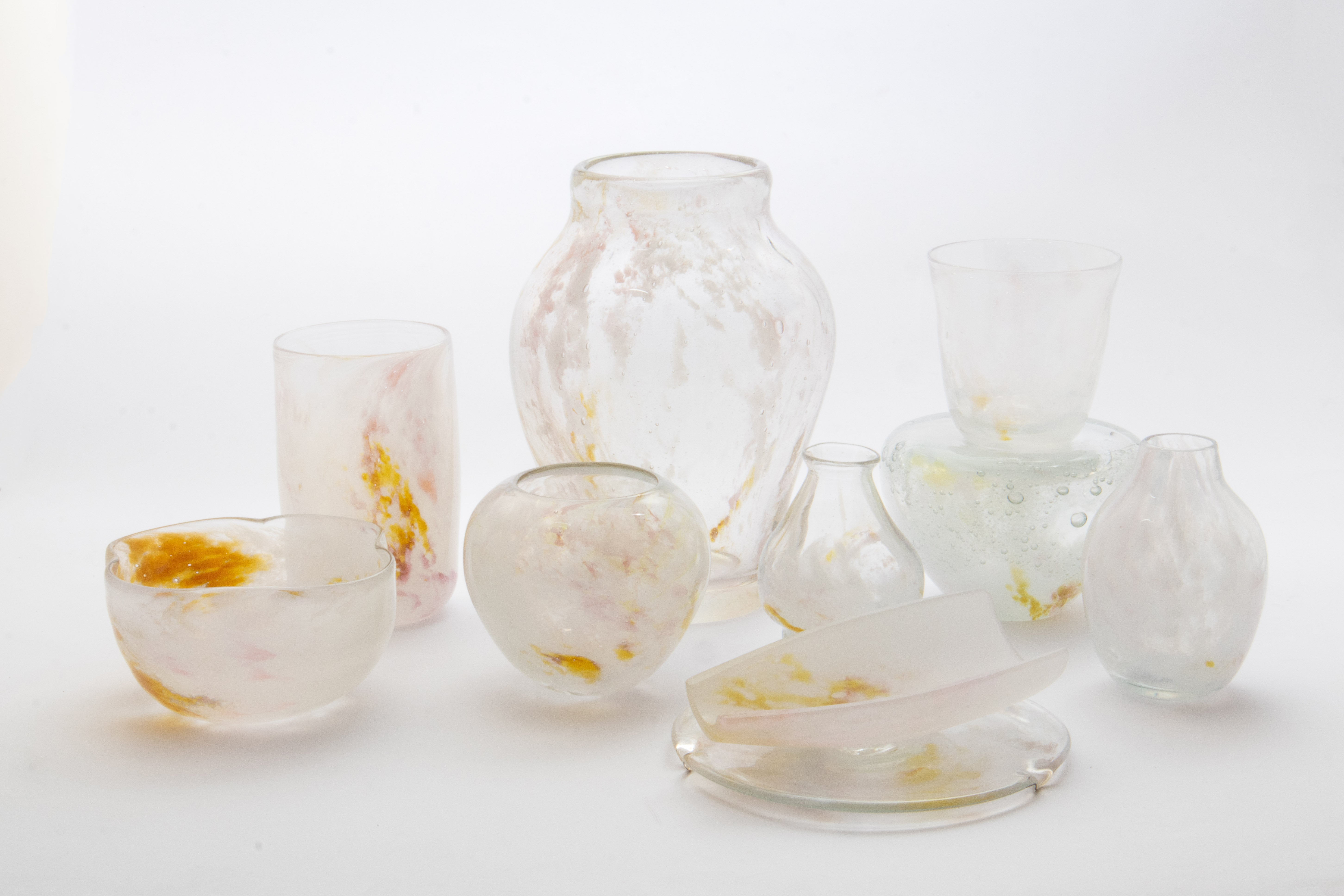 ガラスの世界では、透明はすべての色の調和。さまざまな色ガラスの欠片をほどよく溶かし合わせると、再び澄んだ透明が生まれる。その中に無数の光の色が息づいている。