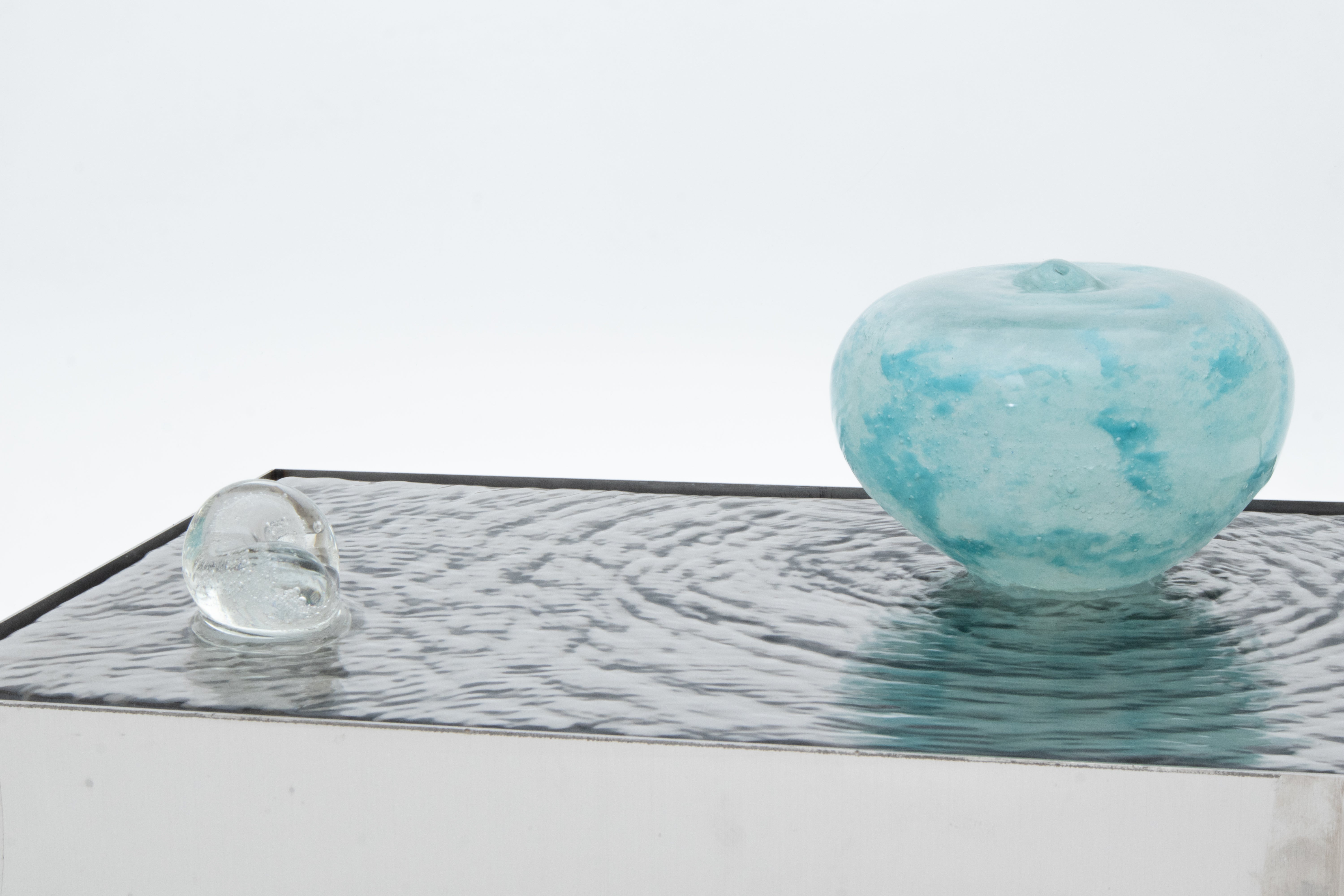 流れゆくガラスが光を映す鏡面となり、水の揺らぎと静寂のガラスが響き合う。その対比が、記憶の中に漂う儚い時間のかけらを映し出す。