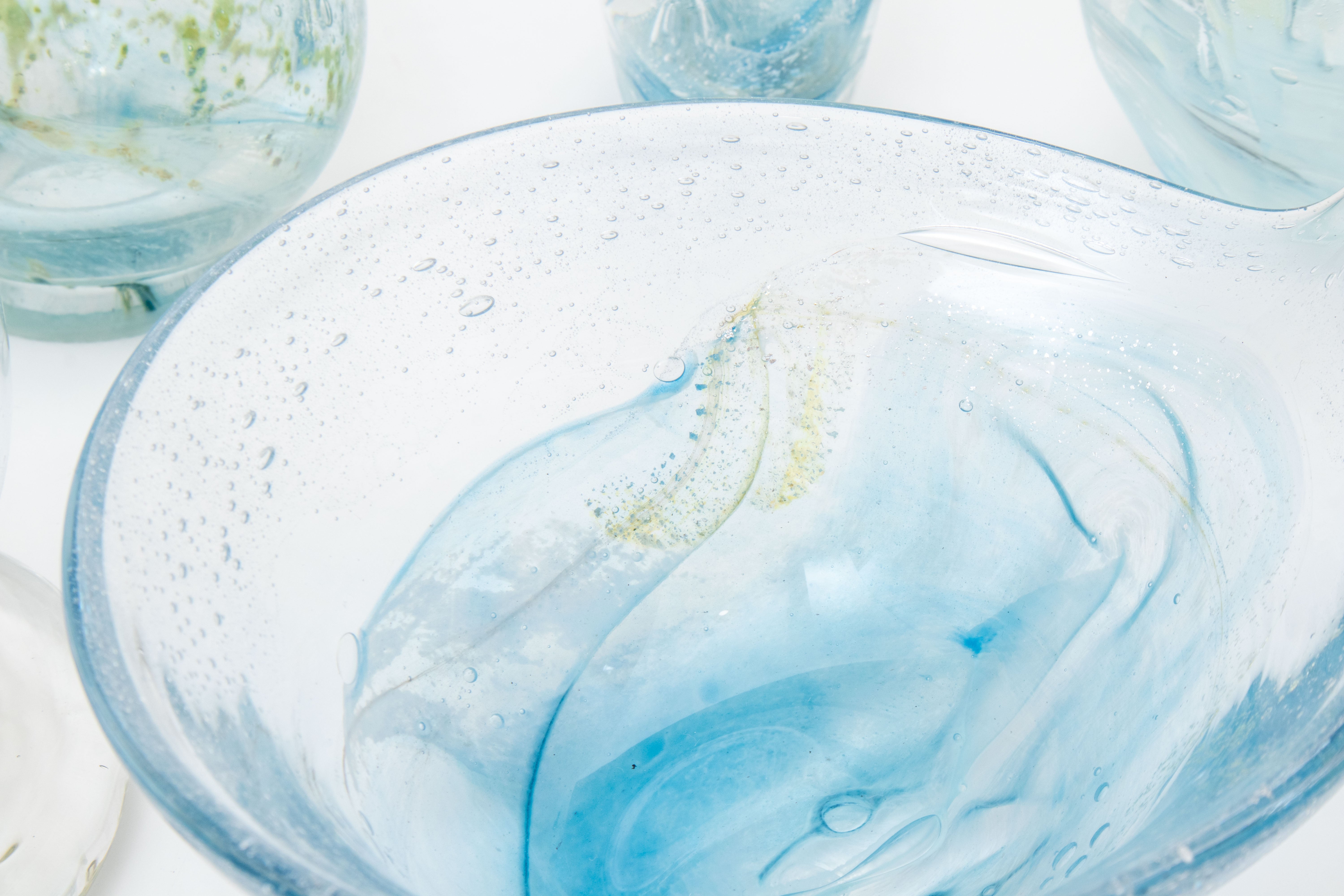 用淡青色氣泡玻璃帶來清涼與消暑感。想像刨冰、涼麵、水果、冰淇淋裝進去時,細小的水滴在玻璃表面成形,涼爽的感受從手心傳到了心裡。
